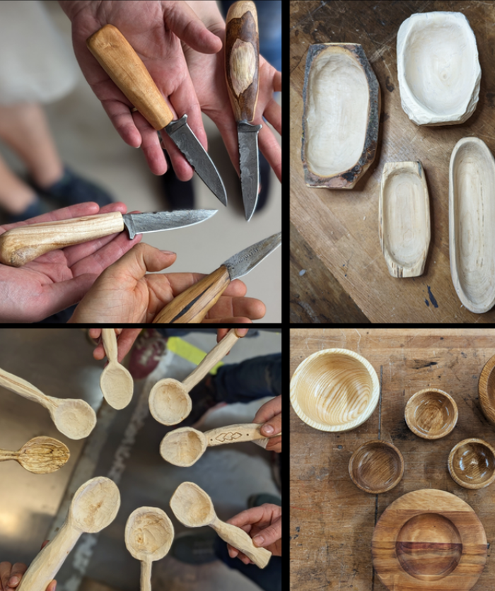 Du lernst welche Hölzer sich für was eignen, den Umgang mit dem Schnitzmesser und anderem Werkzeug.
